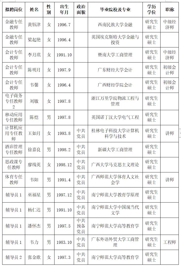 根據(jù)《關(guān)于印發(fā)<廣西壯族自治區(qū)事業(yè)單位公開招聘人員實(shí)施辦法>的通知》(桂人社發(fā)〔2011〕155號(hào))及《廣西金融職業(yè)技術(shù)學(xué)院2024年第一批公開招聘非實(shí)名人員控制數(shù)工作人員公告》的有關(guān)規(guī)定,通過報(bào)名、資格審查、考試、考核、體檢等程序,經(jīng)研究決定,擬聘黃鈺津等19位同志為我校工作人員。現(xiàn)將擬聘用人員名單予以公示,公示時(shí)間為2024年6月18日-2024年6月24日,如有異議,請(qǐng)于2024年6月24日下午5:00前以書面形式并署真實(shí)姓名反饋到學(xué)校紀(jì)委或人事處。聯(lián)系地址:廣西南寧市大學(xué)西路168號(hào),郵政編碼:530007,聯(lián)系電話:0771—3481338,0771—3481779。