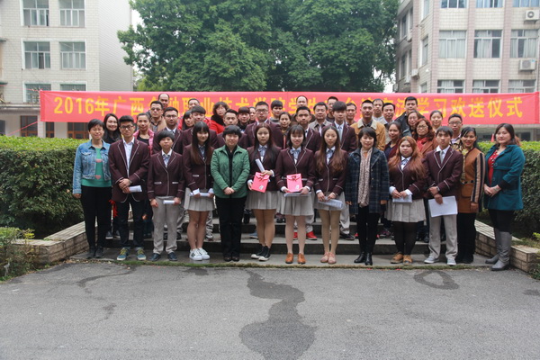2月19日上午,我院舉行2016年學生赴臺灣學習交流歡送儀式。學院黨委書記覃艷娟,院長沈立君,各相關處室負責人,指導老師,班主任,家長和全體赴臺同學參加歡送儀式。