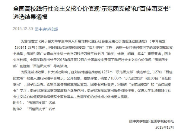 近日,由團(tuán)中央學(xué)校部、全國(guó)學(xué)聯(lián)秘書(shū)處開(kāi)展的踐行社會(huì)主義核心價(jià)值觀“示范團(tuán)支部”創(chuàng)建和“百佳團(tuán)支書(shū)”尋訪活動(dòng)順利落幕。我院金融系金融管理與實(shí)務(wù)2015級(jí)1503班團(tuán)支部在此次活動(dòng)中被確定為全國(guó)高校踐行社會(huì)主義核心價(jià)值觀“示范團(tuán)支部”,特此報(bào)喜!望各團(tuán)支部積極向該團(tuán)支部學(xué)習(xí),更好地發(fā)揮團(tuán)支部的基層戰(zhàn)斗堡壘作用,幫助大學(xué)生更好地踐行社會(huì)主義核心價(jià)值觀,為同學(xué)們的成長(zhǎng)成才搭建更好的平臺(tái)。