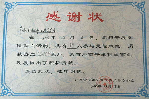 廣西首府南寧獻血委員會辦公室對我院此次無償獻血活動密切關注,并在活動結束后為我院頒發了感謝狀,對我院師生在活動中作出的貢獻表示崇高的敬意和衷心的感謝。