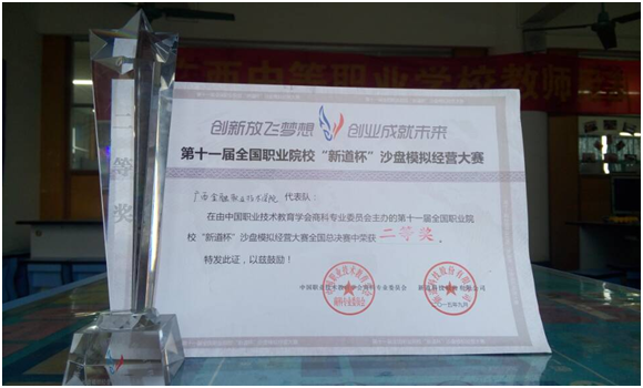 2015年9月20日第十一屆全國職業院校“新道杯”沙盤模擬經營大賽全國總決賽在山東商業職業技術學院落下帷幕。經過了兩天的激烈角逐,由我院會計系韋曉嵐老師、張祺老師帶領的廣西金融職業技術學院沙盤代表隊在本次大賽中獲得了全國二等獎的好成績!