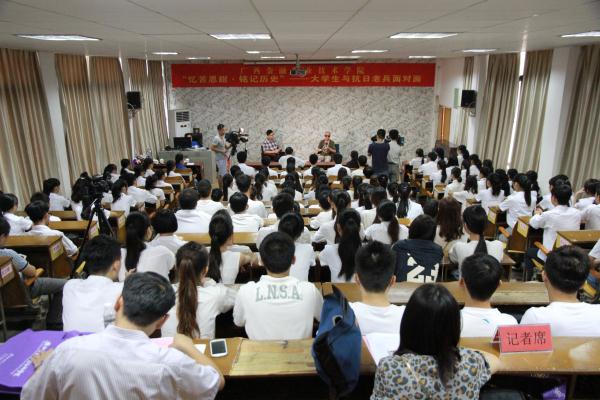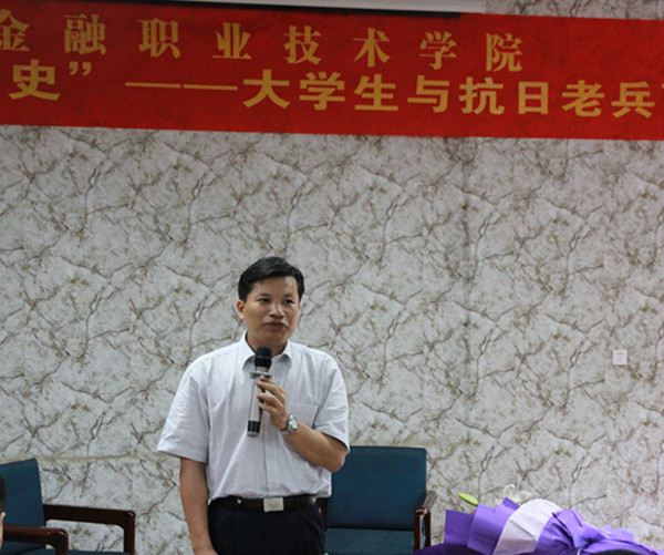 在中國人民抗日戰爭暨世界反法西斯戰爭勝利70周年到來之際,為使青年學生更好地銘記歷史,激發強大的愛國熱情,同時為更好地弘揚抗戰精神,關愛抗戰老兵,9月1日上午10:00,廣西金融職業技術學院以“憶苦思甜?銘記歷史”為主題,在大學路校區舉行“大學生與抗日老兵面對面”活動。97歲高齡的抗戰老兵吳肯老人和壹方關愛抗戰老兵項目負責人鄭加莉女士應邀出席。對話活動由廣西金融職業技術學院學生工作與招生就業處唐雪濤副處長主持。學院黨委副書記、紀委書記劉華政,團委副書記朱麗君及學生200多人代表參加了本次活動。活動吸引廣西電視臺新聞頻道、廣西日報、中國教育報駐廣西記者站等駐邕新聞媒體的廣泛關注。