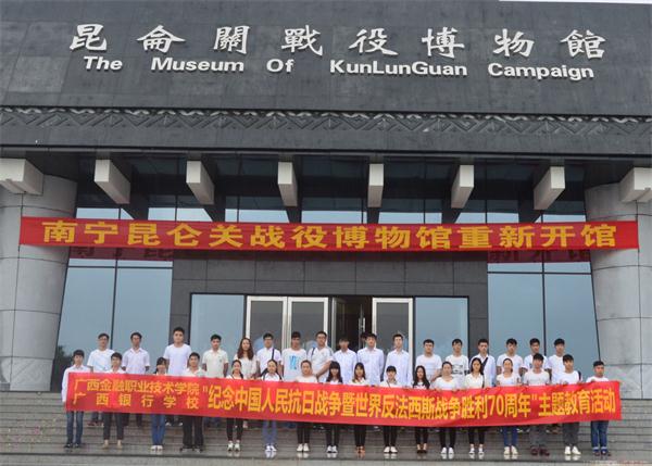 為銘記歷史,弘揚愛國主義精神,繼承革命先烈的大無畏精神,9月1日,廣西金融職業技術學院(廣西銀行學校)組織四十多名學生代表赴昆侖關戰役遺址,開展主題為“祭奠英烈魂 共筑中國夢”的愛國主義教育活動。本次活動為我校“紀念中國人民抗日戰爭暨世界反法西斯戰爭勝利70周年”主題教育系列活動之一。
