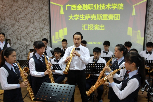 據悉,本樂團共分為高音部、中音部、次中音部和上低音部4個聲部,由24名熱愛音樂、崇尚音樂的學生組成,是廣西第一支薩克斯重奏團。
