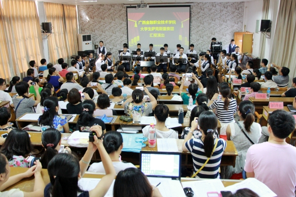 由學校出資組建的廣西金融職業技術學院大學生薩克斯重奏團首先進行了匯報演出,高音部、中音部、次中音部和上低音部樂手分別為全體教職員工送上雪絨花、送別、歡樂頌等婉轉悠揚的世界經典名曲,并合奏了愛的禮贊以及北京奧運會開幕式的主題曲我和你,樂團成員們精神飽滿、全情投入,配合默契音調和諧、動作整齊規范,給在場觀眾奉上了一場別開生面的視覺、聽覺盛宴,獲得在場觀眾的一致好評,現場響起一陣又一陣雷鳴般的掌聲。