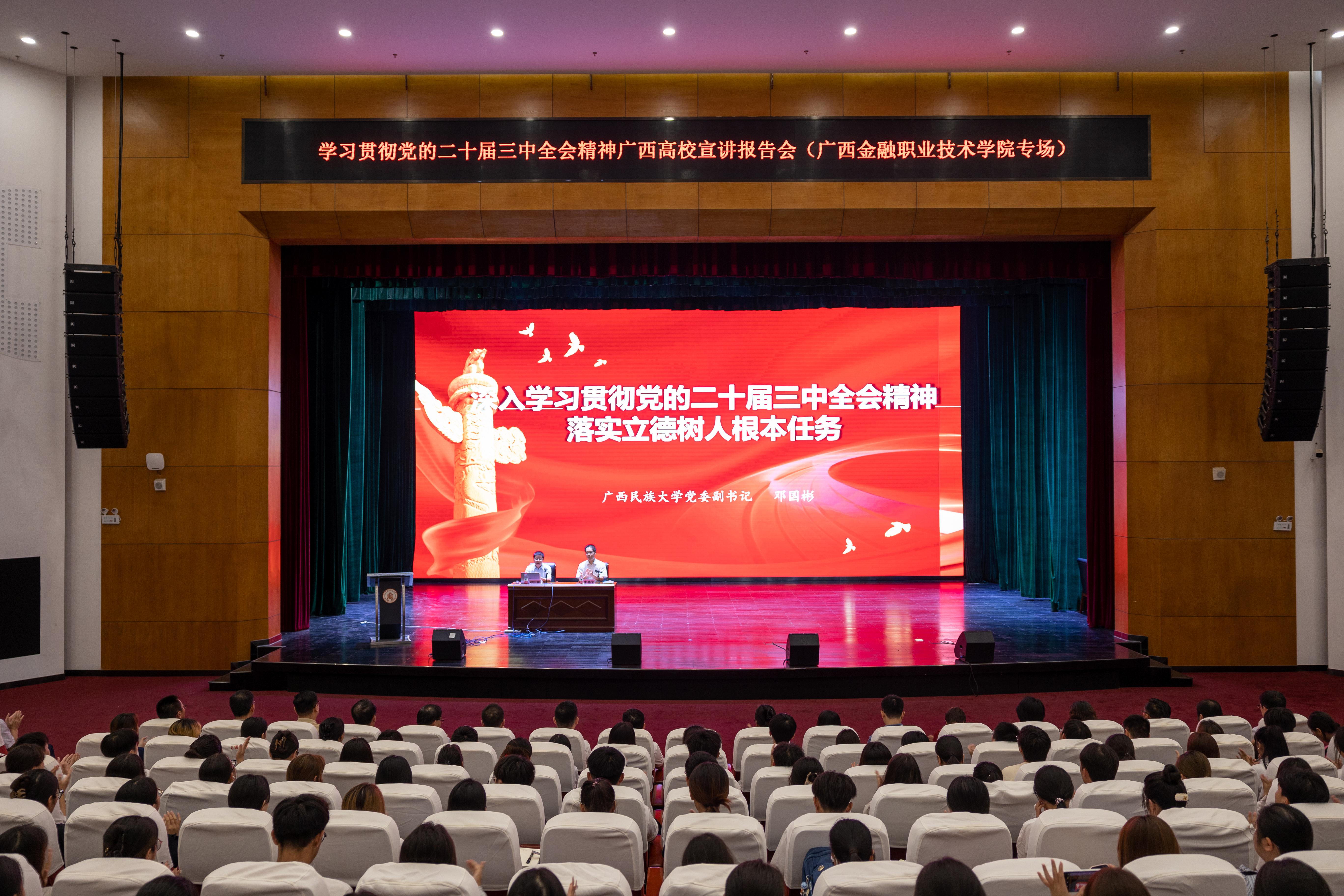 李高巖在主持報告會時指出,全校上下要以本次報告會為契機,提高站位、凝聚共識,把學習貫徹黨的二十屆三中全會精神作為當前和今后一個時期的重大政治任務;精心組織、多措并舉,切實把思想和行動統一到黨的二十屆三中全會精神上來;擔當作為、真抓實干,把學習貫徹黨的二十屆三中全會精神與加快推動學校高質量發展緊密結合。作為教育工作者,我們還要大力弘揚教育家精神,擔負起立德樹人的光榮使命,努力辦好人民滿意的職業教育,將全會精神轉化為工作實績,以更加堅定的信念、更加主動的擔當,為黨育人、為國育才,以改革精神推動學校高質量發展不斷取得新成就,奮力譜寫中國式現代化廣西金職院實踐新篇章。
