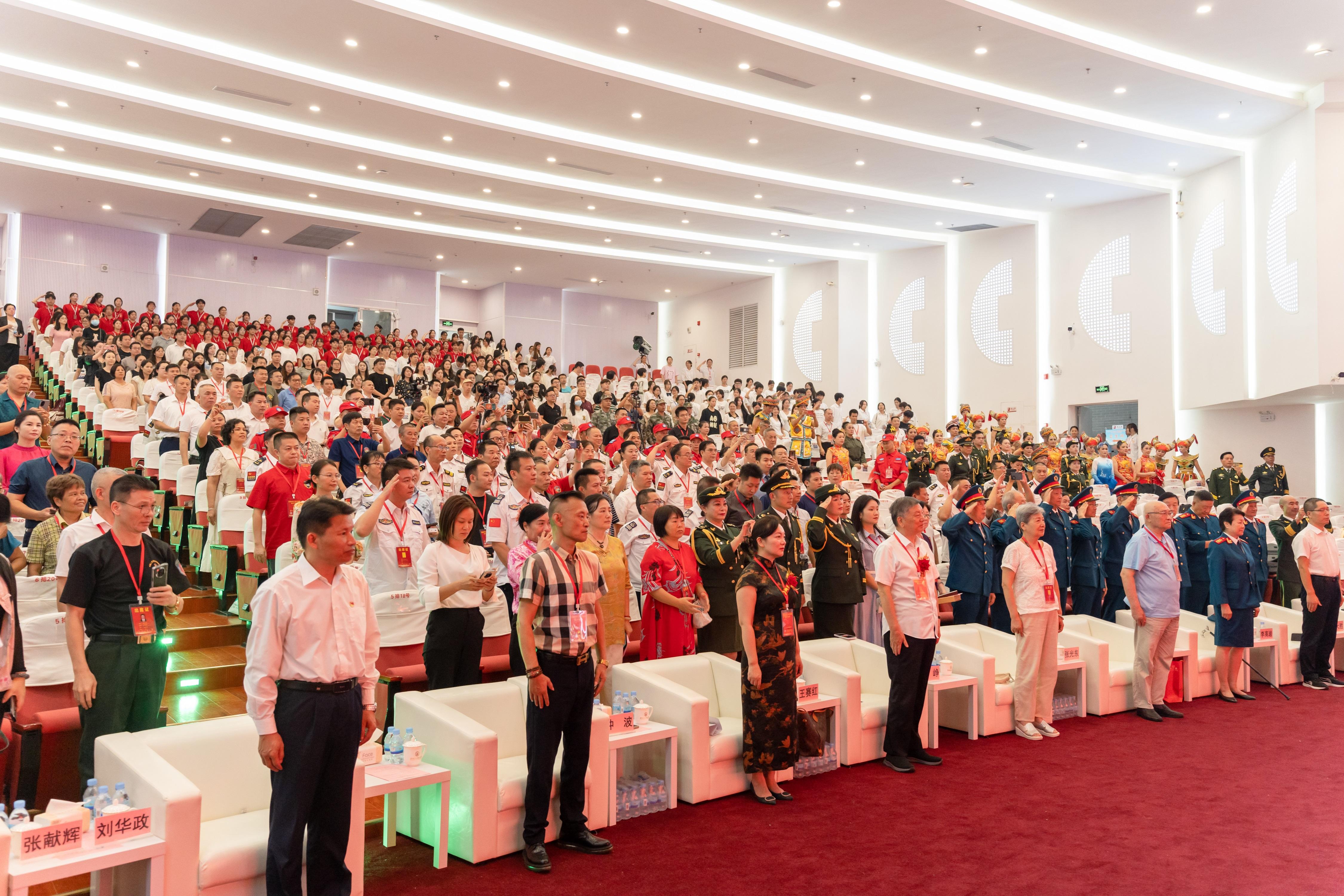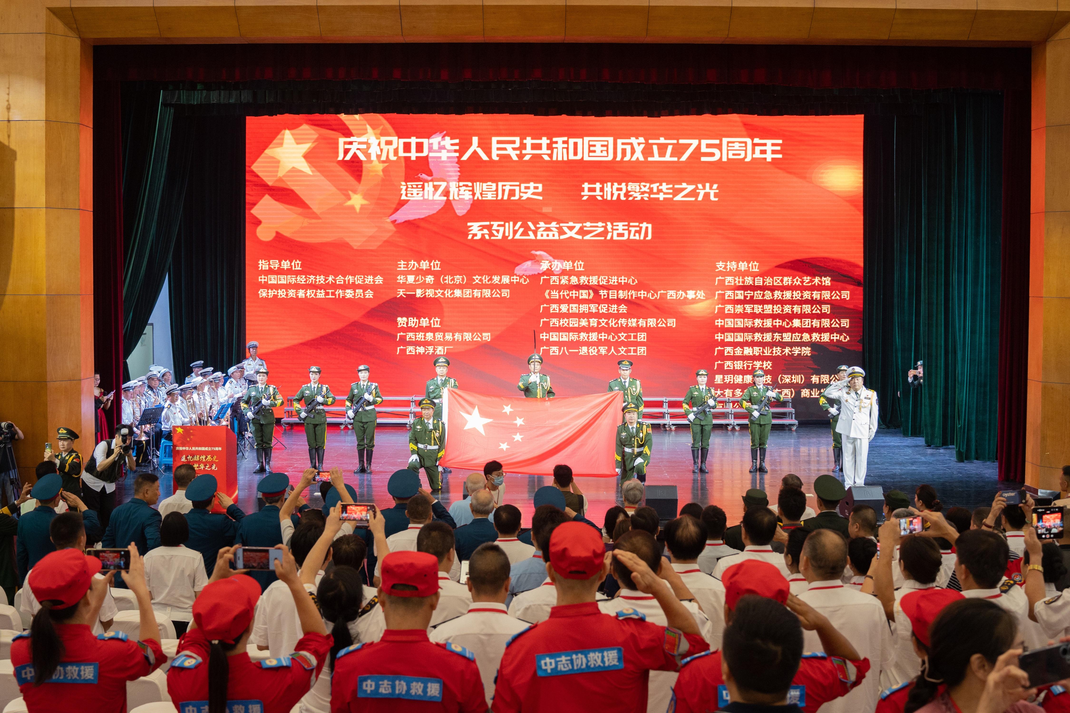 活動在莊嚴的國歌聲中拉開帷幕?,F(xiàn)場氣氛莊嚴,由廣西八一國旗護衛(wèi)隊護衛(wèi)國旗進場,他們邁著整齊劃一、堅定有力的步伐,護送著鮮艷的五星紅旗走向舞臺。