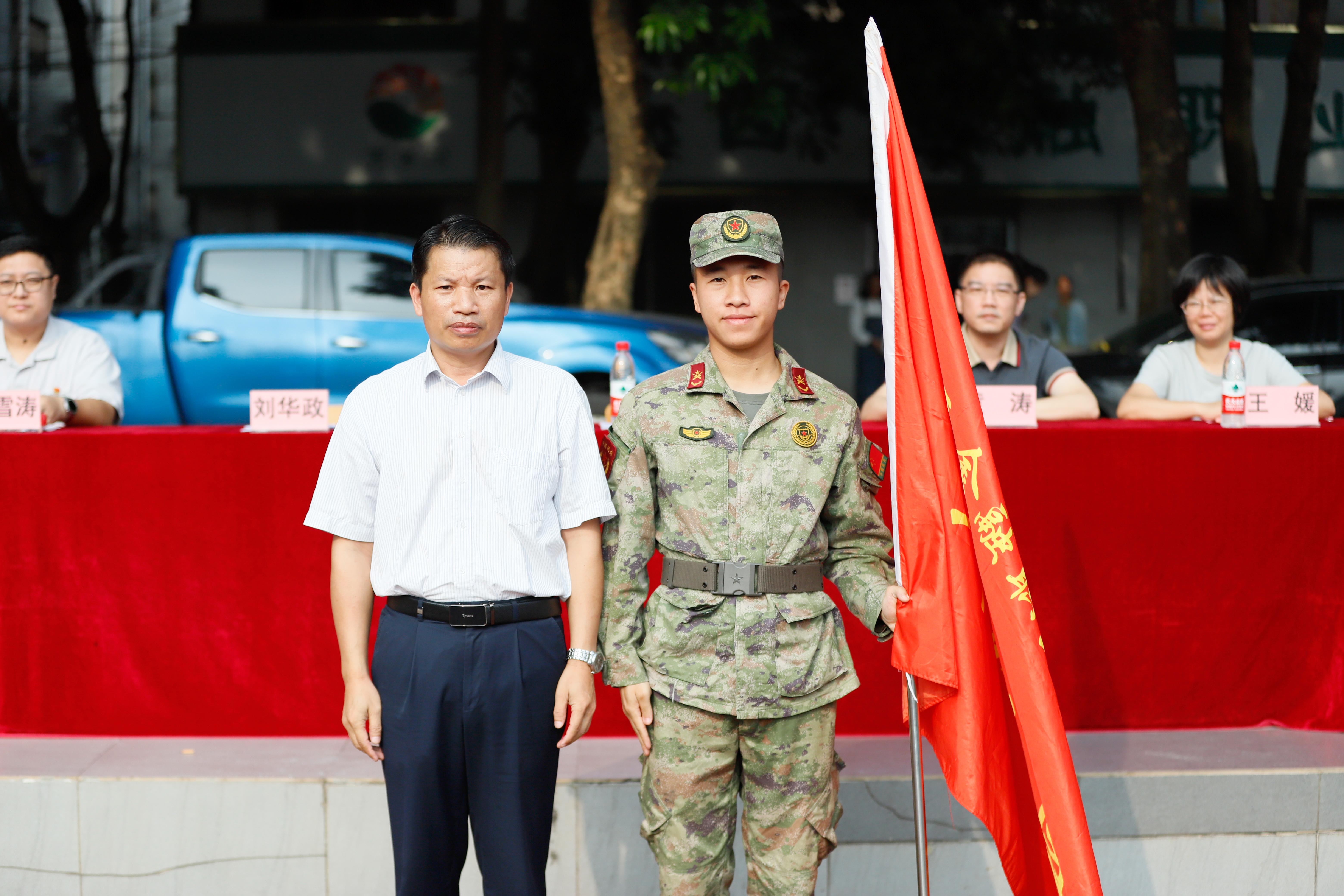 會上,莫海燕校長和劉華政副書記向承訓單位授軍訓團團旗,鮮紅的旗幟高高飛揚,標志著我校2024級新生軍訓正式拉開帷幕。