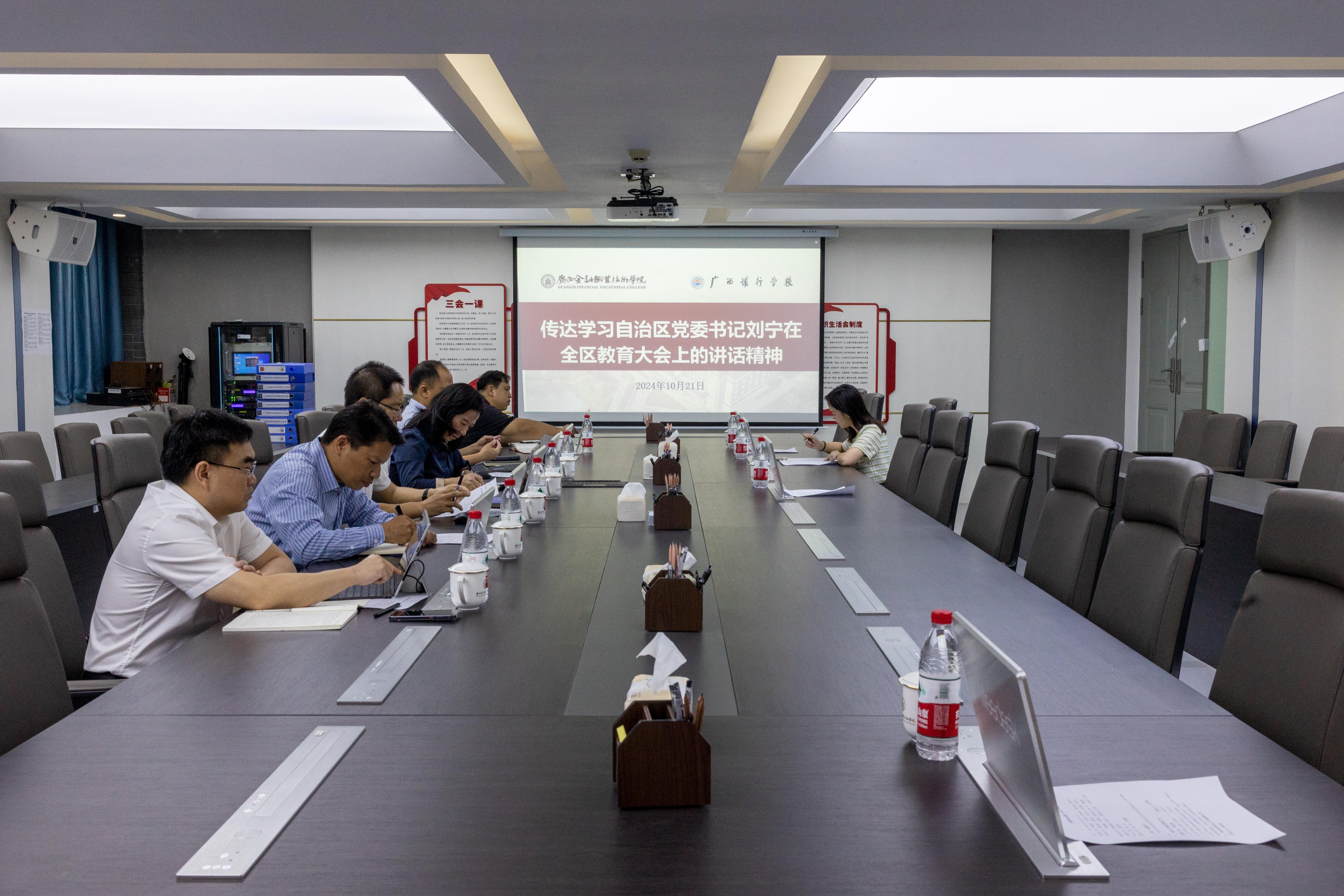 會議要求,我們要認真學習領會劉寧書記在全區教育大會上的講話精神,扎實抓好學校改革發展各項工作,努力為全區教育大局作出貢獻。一要迅速行動起來,切實做好劉寧書記講話和全區教育大會精神的學習宣傳貫徹;二要緊跟廣西教育步伐,把大會精神轉化為加快建設教育強區的金院實踐;三要堅定信心狠抓落實,奮力助推教育強區建設的戰略任務和重大舉措落實落地。