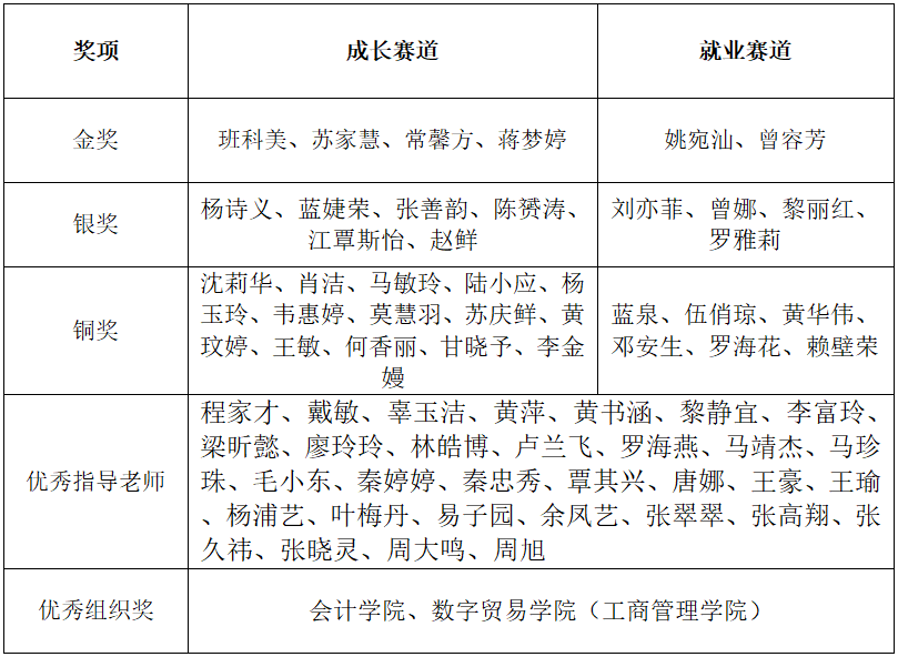 此次選拔賽由招生就業處牽頭統籌,各二級學院積極配合,我校共計有7360人報名參加校賽,經二級學院初選,共推選了35名優秀學生進入學校選拔賽。通過網絡評選和現場比賽兩輪決賽的激烈角逐,最終,班科美、蘇家慧、常馨方、蔣夢婷、姚宛汕、曾容芳等6名學生榮獲金獎,楊詩義等10人榮獲銀獎,沈莉華等19名學生榮獲銅獎,程家才等31位老師榮獲優秀指導老師稱號,會計學院、數字貿易學院(工商管理學院)榮獲優秀組織獎。
